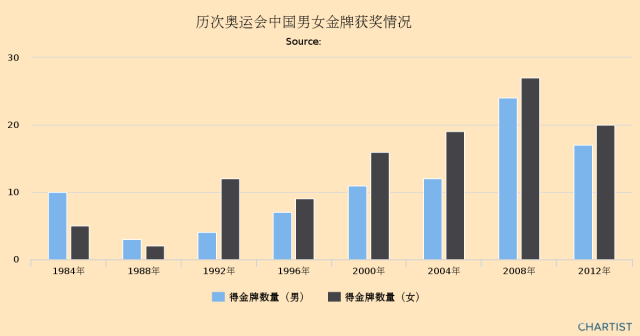 但请看下面的中国奥运金牌图,黑杠是中国女子的金牌数,蓝杠是男子的,黑杠是不是多过蓝杠!