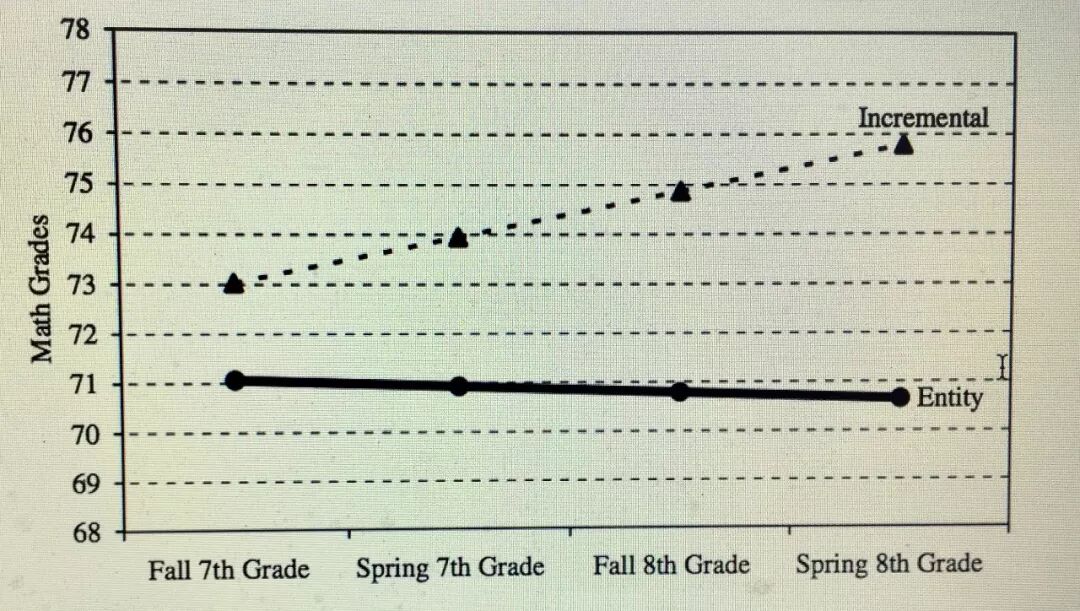结果发现:相信聪明主要是天生的学生,数学平均成绩持续下降;相信聪明主要是后天学习得来的,数学成绩是上升的!