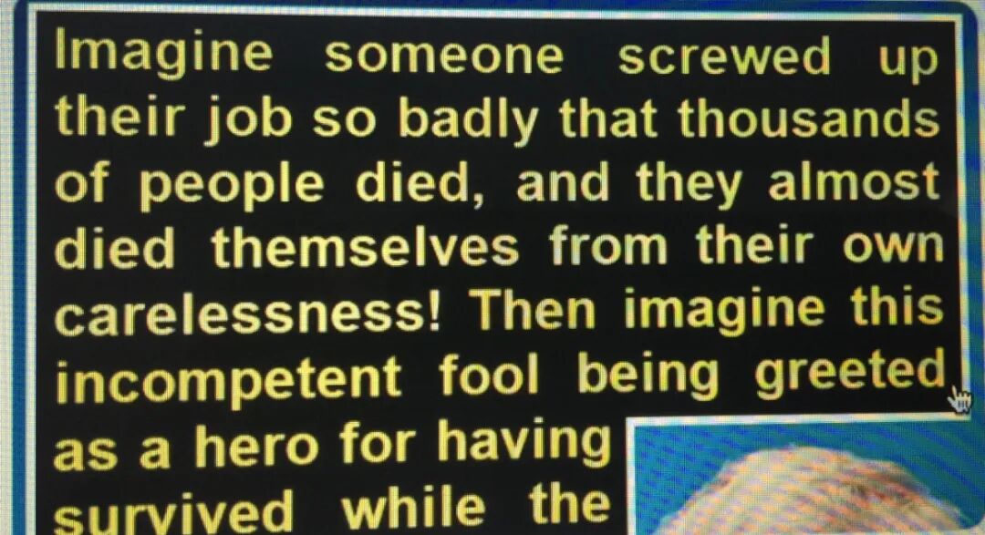 下面这个哥们写的有意思,他说:“想像一下,一个人因为疏忽把事干砸了,导致很多人死亡,包括他自己也差点丧命。可是这个无能的傻瓜被救活后,却被称为英雄!“