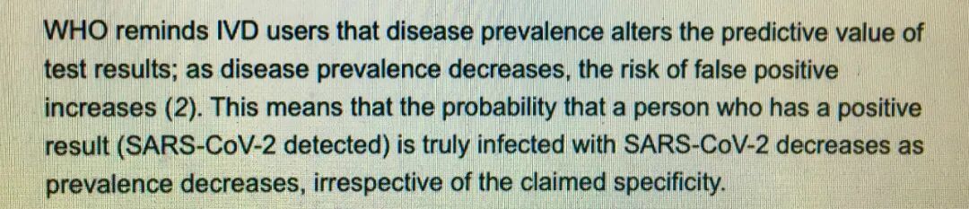 他还说:“每个人身上几乎有世界上所有病毒的原子。”核酸检验不是化验,是推算。它是从一个原子,推算出病毒的方法。”Kary Mullis 特别强调说:“这个方法用到极致,可以在任何人身上发现任何病毒。因此,核酸检验出你有这种病毒(HIV),不代表你有艾滋病。核酸检验出的病毒和人身上的病毒,不是苹果对苹果的关系”下面是Kary Mullis 说这段话的视频,也请这几个医生看看。注2认为核酸检验是诊断新冠金标准的专家们,莫非比发明者本人更了解这个工具?该《通告》还特别强调:“核酸检验假阳性同新冠感染率呈反比——群体感染率越低,假阳性越多。也就是说:在低感染地区,如果一个人检验结果是阳性,不论阳性指标多高,他(她)真染上新冠的可能性也比较低。”