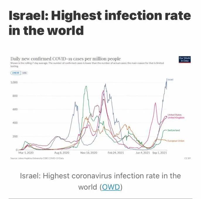 以色列Ben Gurion大学的免疫学家说:“目前以色列的疫情很诡异——我们即是世界最高比例的疫苗接种人群,也是世界最高比例的感染人群,这让世界迷惑了。”注1