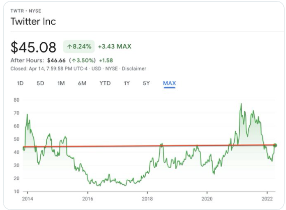 这还是因为4月4日,马斯克宣布买了Twitter9%的股份,股价一下子升了10元所致。