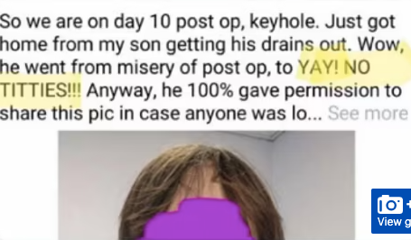 2021年11月23日,美国一个14岁刚刚做完变性手术女孩的家长,把她被切掉乳房的前胸照片放在Twitter上,说:“手术后第10天,我们儿子从医院回来了。他手术的痛苦换来现在这样的喜悦 ——‘哇,乳房没了!’ 儿子100%允许我们把他的照片分享到网上。” 注1