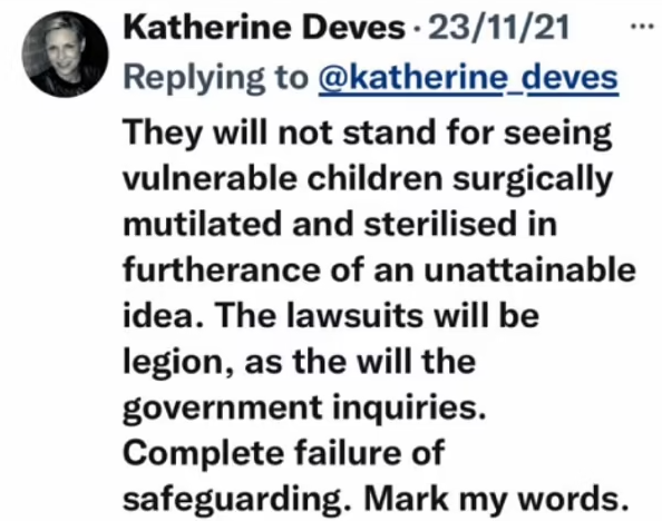 Katherine 在这个Twitter下写到:“社会不会允许为了满足(青少年)虚幻的目标,把不能自我保护孩子的生殖器官割掉绝育(curgically mutilated and sterilised")。这是孩子监护人的彻底失职,请记住我的话,政府会调查,官司会等着你们。”