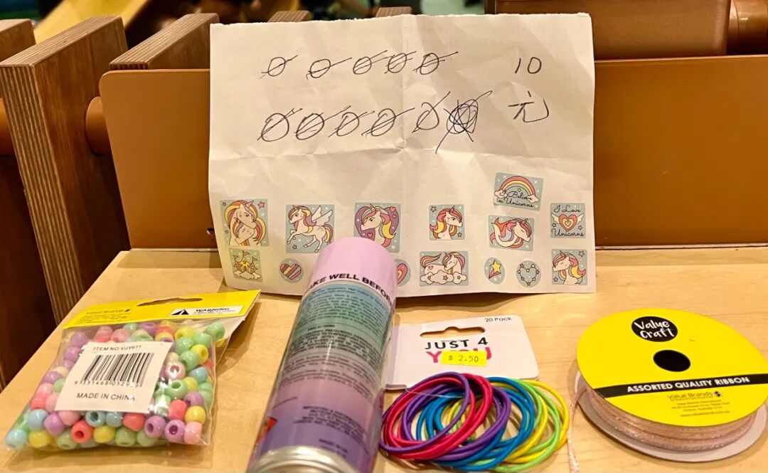 请仔细看这四样礼品中,有一罐是喷头发颜色的喷发剂。它是丫丫准备给参加生日聚会的人,往头发上喷的颜色,可以很容易用水洗掉。这二个月,丫丫知道自己要过生日很兴奋,每周经过商场都要求买一些过生日的东西。丫丫真是个听话的孩子,被我这样拒绝了至少4次,她每次都说:“好。”昨天,我给她一张纸,上面画了10个圈。我说:“后天你就过生日了。我给你10元钱,你自己买礼品;买什么都行,只要不超过10元就行。”我又说:“你选礼品时,要看上面的价钱标签;如果价钱前面写1,你就划掉一个圈;如果写2,你就划掉2个圈.....;把所有圆圈划满,你就不能买了。”为了实战时计算正确,采购前,我俩还特意练习一遍怎么划圈。到了礼品店,丫丫轻车熟路找到自己要买的东西,因为她已来过这里多次了。丫丫非常喜欢做手工,她很自信的挑了彩色橡皮筋,穿项链的小珠子、彩色线,顺手又拿了这瓶彩色喷发剂;这几样东西刚刚超过10元。她走到卖裙子的货架,又想要她的偶像——爱莎公主的裙子。我说:“这裙子15元,已经超过10元了;如果你想要这个裙子,其他东西就不能买了;再说,你已经有了二三件爱莎裙子了。”