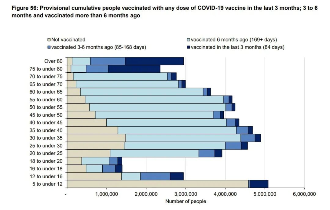 上图黄色是没打疫苗的人,最浅蓝色是六个月前打过疫苗的人的;深蓝色和第二浅蓝色是过去3个月和6个月打过加强针的人。