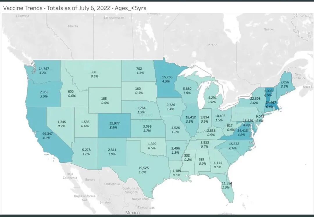 美国也给5岁以下的孩子打疫苗,情况跟英国差不多,请看下图,截至7月6日,只有二个州5岁以下孩子打疫苗的比例超过5%。注3