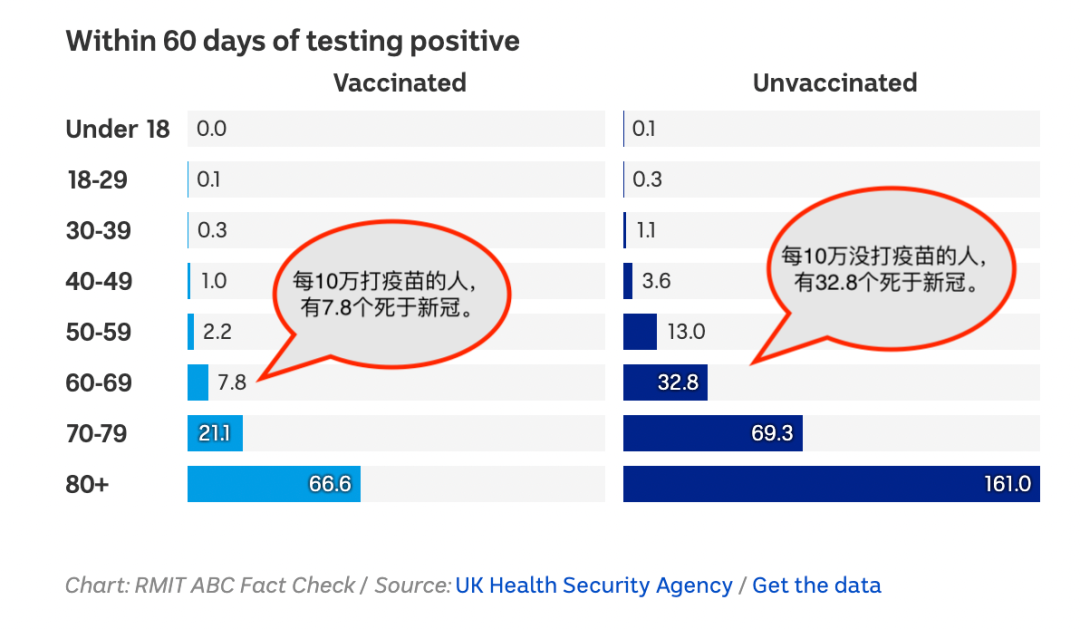 他看后,说:“当然建议你打。你看:10万个60-69岁打了疫苗的人,只有7.8人死于新冠;10万没打疫苗的人,有32.8人死亡于新冠,这说明疫苗对这个年龄段的有效性相当高,能把死亡风险降低四倍多!(32.8/7.8=4.2)”